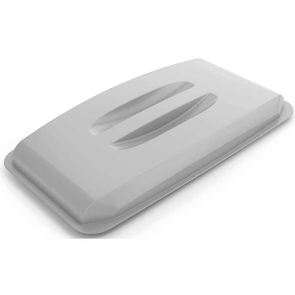 Abfall-/Wertstoffbehälter mit Deckel, DURABIN ECO. Rechteckige Form. Vielseitige Helfer für das Abfallmanagement sowie für Transport und Lagerung von Rohstoffen in Gewerbe und Industrie. Ideal für Müllsammlung und Recycling-Materialien im Innenbereich. Mit robusten Tragegriffen für einfachen Transport. Haltevertiefungen auf der Bodenunterseite zum sicheren Entleeren. Mit Klemmschlitzen für Abfallsäcke. Der Behälter kann ineinander gestapelt werden. Gewicht: 2.380 g. Inklusive Deckel mit 2 Griffmulden oben für leichtes Abnehmen. Größe BxHxT): 501 x 58 x 272 mm. Behälter und Deckel aus recyceltem Polypropylen (PP)-Kunststoff, zertifiziert mit dem Umweltzeichen „Blauer Engel“. Volumen: 60 Liter. Größe (BxHxT): 590 x 600 x 282 mm. Farbe: grau