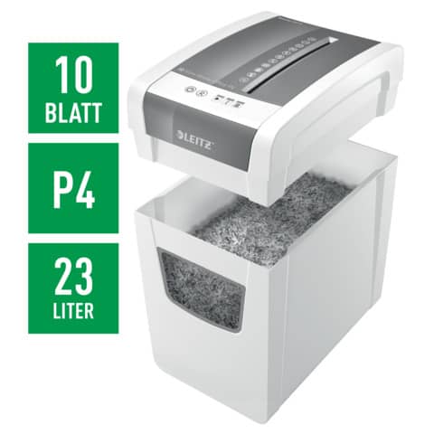 Eigenschaften "Aktenvernichter IQ Slim Home Office, Partikelschnitt P4, 10 Blatt, weiß LEITZ 8001-00-00"
