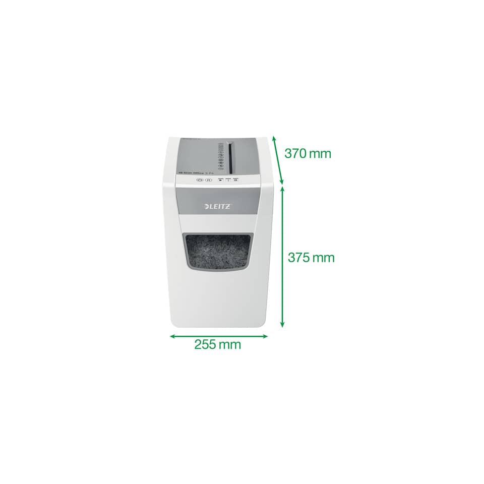 Leitz IQ Aktenvernichter Slim Office S P4. Kompakter, elektrischer Aktenvernichter für kleine Büros mit 1-2 Benutzern. Manuelle Papierzuführung. Mit Touch Control und Anti-Papierstau-Technologie. Mit Autoreverse und Auto Start/Stop. Mit LED-Anzeige für Überhitzungsschutz. Dauerbetrieb 8 Minuten. Mit DC-Motor, extrem geräuscharm. Einfach zu leerender Abfallbehälter mit Sichtfenster durch Abheben des Gerätekopfes. Schnittgut: Papier, Heft- und Büroklammern. Sicherheitsstufe: Partikelschnitt P-4. Blattkapazität: bis zu 12 Blatt (80 g/qm) bzw. bis zu 14 Blatt (70 g/qm) bzw. bis zu 400 Papierschnipsel. Partikelgröße: 4 x 28 mm. Abfallbehälter Auffangvolumen: 23 Liter / 225 Blatt. Schnittgeschwindigkeit: 30 mm/Sekunde für A4/80 g/qm. Maximale Eingabebreite: 220 mm. Leistungsaufnahme: 280 Watt. Geräuschpegel: ca. 55 DbA. Gewicht: 6,5 kg. Format: 255 x 375 x 370 mm. 2 Jahre Garantie, bei Registrierung 3 Jahre Garantie, 2 Jahre Garantie auf das Schneidwerk, GS-Zeichen, CE-Zeichen. Farbe: weiß.
