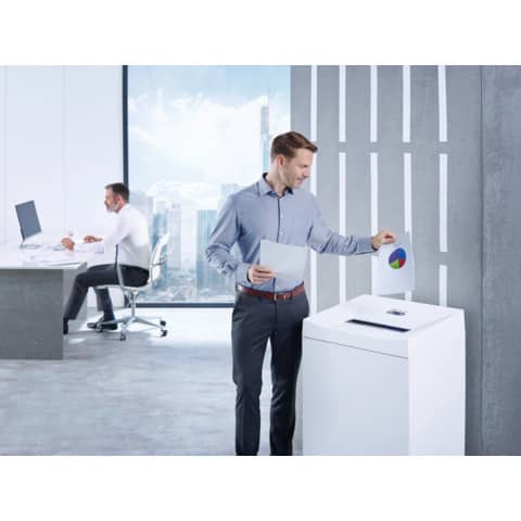Aktenvernichter HSM Pure 940 - 1,9 x 15 mm. Der besonders leistungsstarke Datenvernichter mit extra großem Auffangvolumen für die Abteilung. Das robuste und kraftvolle Schneidwerk mit großer Eingabebreite überzeugt durch die hohe Durchsatzleistung und Dauerbetrieb. Die hochwertigen Materialien und die bewährte Qualität „Made in Germany“ garantieren Sicherheit und Langlebigkeit. Die induktionsgehärteten Vollstahl-Schneidwellen mit lebenslanger Garantie sind unempfindlich gegen Heft- und Büroklammern und garantieren Langlebigkeit. Der kraftvolle Motor stellt eine hohe Schnittleistung und den zuverlässigen Dauerbetrieb sicher. Der leise Betriebsmodus minimiert die Geräuschentwicklung am Arbeitsplatz. Für eine hohe Energieeinsparung sorgt die Stand-by Funktion, wenn der Aktenvernichter nicht in Gebrauch ist. Der Papiereinzug mit Überlastungsschutz reduziert Papierstau und erhält die hohe Durchsatzleistung. Ein leichter Druck auf das Sicherheitselement verhindert den unbeabsichtigten Einzug und stoppt sofort die Papierzufuhr. Eine integrierte Lichtschranke startet das Gerät automatisch bei Papierzufuhr. Der Aktenvernichter ist einfach und bequem auf Rollen fahrbar. Komfortables Entnehmen und Entleeren des herausziehbaren Mehrweg-Auffangbeutels im robustem Holzunterschrank mit weitem Tür-Öffnungswinkel. Der volle Auffangbehälter wird mittels Anzeige signalisiert und das Gerät schaltet automatisch ab. Lieferumfang: Mehrweg-Auffangbeutel (5 Stück), Schneidblock-Spezialöl (50 ml) bei Partikelschnitt-Varianten. Besondere Ausstattungsmerkmale: Sicherheitselement / Separater CD-Auffangbehälter / Rollen / Multifunktionsbedientaste / Dauerbetrieb / Automatischer Rücklauf . Art der Betätigung des Schneidwerks: Lichtschranke. Behälter-/Auffangvolumen: 165 l. Schnittgut: Papier / Kreditkarte / CD/DVD / Heft- und Büroklammern. Leistungsaufnahme: 2100 W. Eingabebreite: 400 mm. Schnittart: Partikelschnitt. Schnittgröße: 1,9 x 15 mm. Sicherheitsstufe (DIN 66399): P-5 / O-4 / T-5 / E-4 / F-2. Schnittleistung in Blatt (80 g/m²): 19 - 21. Schnittleistung in Blatt (70 g/m²): 24 - 26. Schnittgeschwindigkeit: 110 mm/s. Spannung/Frequenz: 220 - 230 V/50 Hz. Abmessungen (BxHxT): 620 mm x 1005 mm x 487 mm. Gewicht: 75 kg. Gewährleistungszeit: 24 Monate. Farbe: weiß.