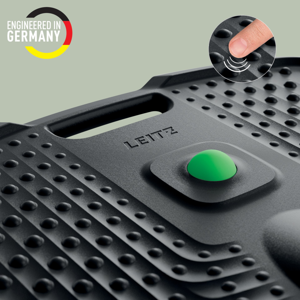 Leitz Anti-Ermüdungsmatte Ergo Active. Moderne und ergonomische Anti-Ermüdungsmatte für Steharbeitsplätze in Home Office oder Büro. Stehmatten können sich positiv auf das allgemeine Wohlbefinden auswirken, indem sie die Körperhaltung verbessern und die durch langes Stehen verursachte Belastung der Füße, Beine, des unteren Rückens und der Gelenke verringern. Der erhöhte Rand regt auf natürliche Weise die Bewegung der Füße an und aktiviert so regelmäßig den ganzen Körper, während die weichen Massagenoppen eine wohltuende Fuß Massage bieten - barfuß oder mit Socken zu verwenden. Unterschiedliche Massagezonen sowie der Massageball helfen, Stress vorzubeugen und abzubauen, Muskelverspannungen zu lösen, die Blutzirkulation zu fördern und Dehnungen zu unterstützen. Mit einzigartigem, herausnehmbarem Massageball (50 mm), der für eine tiefe, gezielte Entlastung Ihrer Füße sowie müder Handgelenke und Schultern sorgt. Die erstklassige, ultraweiche, gepolsterte PU-Schaumstoffoberfläche mit Stoßdämpfung unterstützt eine korrekte Körperhaltung und trägt dazu bei, Ermüdung und Beschwerden zu verringern, die durch das Stehen auf harten Oberflächen entstehen können. Die Matte ist aus strapazierfähigem Material gefertigt und eignet sich perfekt für stark frequentierte Bereiche. Der Antirutschboden mit Kratzschutz sorgt für Sicherheit und schützt den Boden. Geeignet für die Verwendung mit Socken, barfuß oder mit Schuhen. Mit wasserabweisender Oberfläche, die vor verschütteten Flüssigkeiten schützt und sich mühelos abwischen lässt. Kompaktes und leichtes Design mit integriertem Griff für einfachen Transport und Aufbewahrung. Auch geeignet zum Aufhängen an einem Leitz Ergo Pegboard (65490000). Plastikfreie, recycelbare Verpackung inklusive Gebrauchsanweisung, keine Montage erforderlich. Material: gepolsterte PU-Schaumstoffoberfläche. Format: 605 x 60 x 681 mm. Farbe: dunkelgrau.