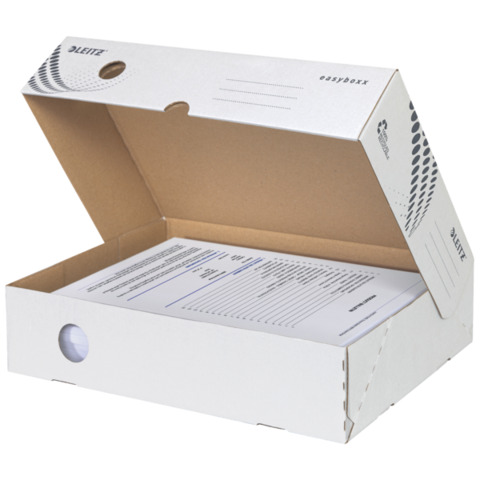 Leitz Archivbox easyboxx 80mm. Breite Öffnung mit Klappdeckel. Für A4 und Folioformat. Mit Verschlußlasche, die unbeabsichtigtes Öffnen vermeidet und das Griffloch verstärkt. Geeignet für Hoch- und Querformat. Mit Automatikboden für einen schnellen und bequemen Aufbau. Mit Beschrifungslinien. Für 700 Blatt Papier. Lieferung flach liegend. Material: 100% Wellpappe (RC), 100% recycelbar. Format Außenmaß: 80 x 250 x 350 mm. FSC®-zertifiziert. Farbe: weiß.