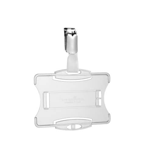 Ausweiskartenhalter. Befestigungstechnik: Metallclip. Für Betriebs/Sicherheitsausweise im Scheckkartenformat. Mit drehbarer Clip-Befestigung. Namensschild kann wahlweise im Hoch- oder im Querformat genutzt werden. Kombinierbar mit Kette, Textilband oder einem Ausweiskartenhalter. Material: Kunststoff. Farbe Rahmen: transparent. Größe (B x H): 85 x 54 mm. Art der Verpackung und Inhalt: 25 Stück.