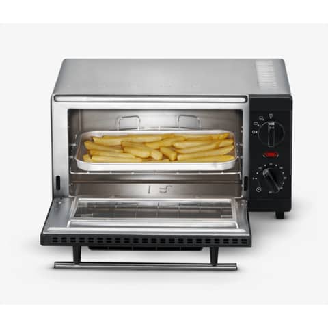 Mini Back- und Toastofen.Vielseitig einsetzbar für die Zubereitung von Pommes, Mini-Pizzen, Aufbacken von Brötchen, etc. Besonders kompakt - findet Platz in jeder Kücher. Ober- und Unterhitze sind getrennt oder kombiniert schaltbar. 4-Stufen Schalter (Aus- Oberhitze - Unterhitze - Ober- & Unterhitze). 60-Minuten-Timer mit Signaltorn nac Beenden der vorgewählten Zeit. Kontrolleuchte. Kurze Aufheizzeit. Inklusive Grillrost und Backblech (LxB: 24,5 x 15 cm). Hochhitzebeständige Lackierung. Rutschfeste Gummifüße. Leistung: 800 Watt, bis ca. 200°C. Garraum-Kapazität: 9 Liter. Größe BxHxT: 31,1 x 20,8 x 36,0 cm. Gewicht: ca 3,2 kg. Farbe: schwarz-silber