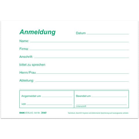Eigenschaften "Besucheranmeldeblock, A6 quer, 50 Blatt RNK 3040"