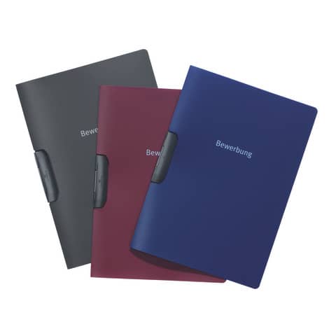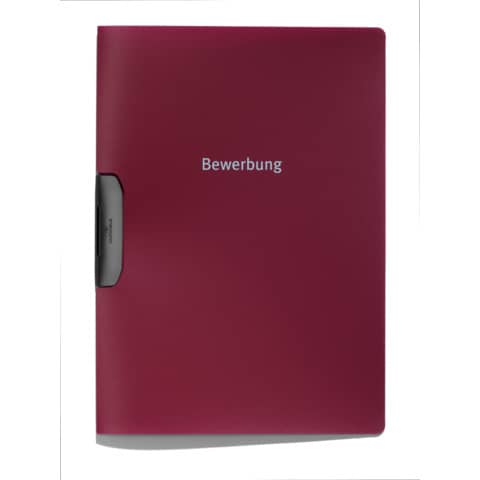 Bewerbungsmappe DURASWING® JOB. Mit Aufdruck "Bewerbung" auf der Vorderseite. Material und Farbe der Klemme: Kunststoff, schwarz. Werkstoff: Polypropylen. Verwendung für Papierformate: DIN A4. Max. Aufbewahrungsmenge: 30 Blatt. Farbe der Vorderseite und Rückseite: aubergine/dunkelrot.