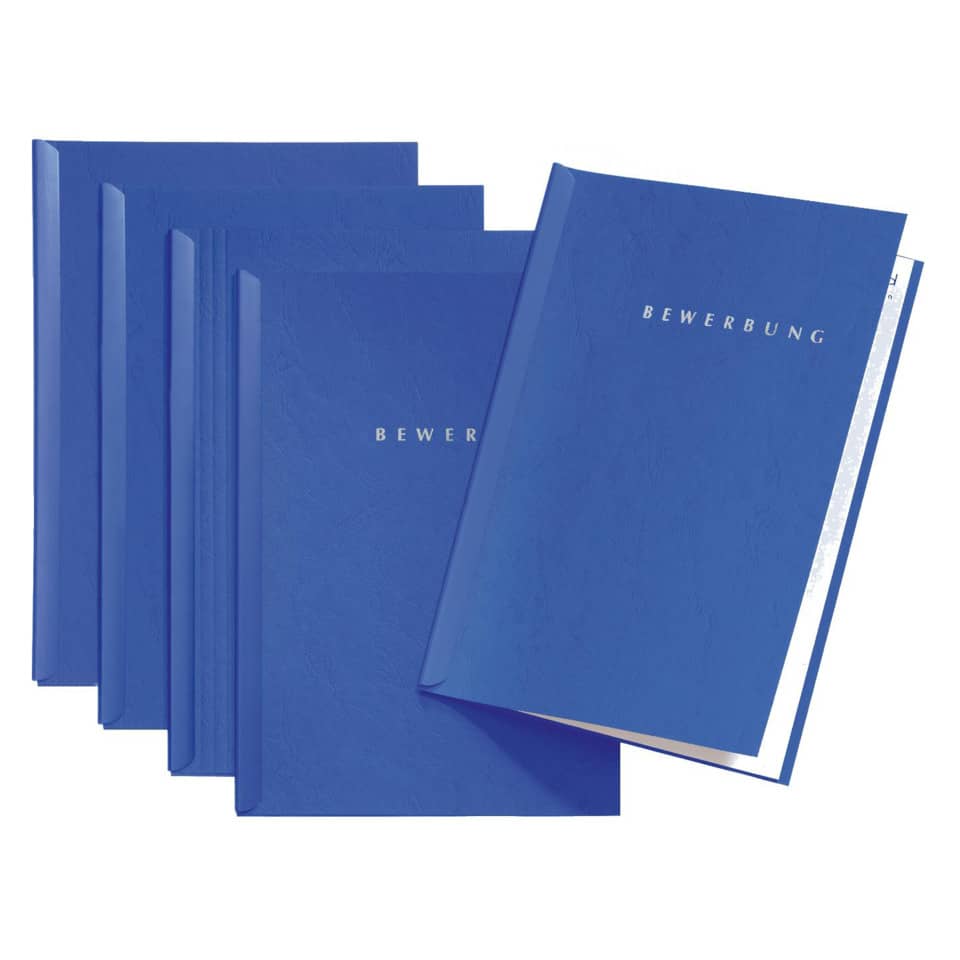 Bewerbungsset START. Inhalt: 5 Klemmschienen und 5 Vorder- und Rückdeckel, Schriftzung BEWERBUNG in silbernen Buchstaben auf dem Vorderdeckel. Hochwertiger Karton. Für Format A4. Größe (B x H): 210 x 300 mm. Farbe: Blau.