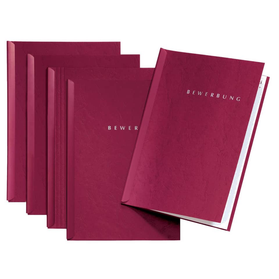 Bewerbungsset START. Inhalt: 5 Klemmschienen und 5 Vorder- und Rückdeckel, Schriftzung BEWERBUNG in silbernen Buchstaben auf dem Vorderdeckel. Hochwertiger Karton. Für Format A4. Größe (B x H): 210 x 300 mm. Farbe: Rot.