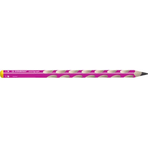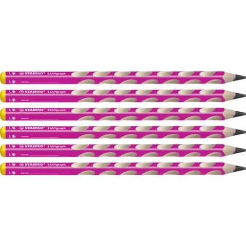 Ergonomischer Dreikant-Bleistift STABILO® EASYgraph. Ausführung der Schaftform: Dreikantform. Gespitzt. Schaft lackiert. Für Linkshänder - sichtbar durch gelben Farbcode am Stiftende. Dreikanform und rutschfeste Griffmulden für eine entspannte Handhaltung. Minendurchmesser 3,15 mm. Holz aus nachhaltiger Waldwirtschaft. Mit Namensfeld. Härtegradkennzeichnung vorhanden. Länge: 175 mm. Farbe des Schaftes: pink. Bezeichnung der Härte: 2B.
