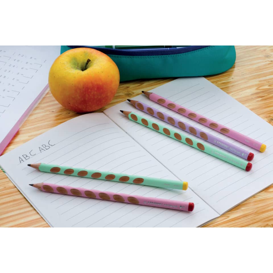 Ergonomischer Dreikant-Bleistift STABILO® EASYgraph. Ausführung der Schaftform: Dreikantform. Gespitzt. Schaft lackiert. Für Rechtshänder - sichtbar durch roten Farbcode am Stiftende. Dreikanform und rutschfeste Griffmulden für eine entspannte Handhaltung. Minendurchmesser 3,15 mm. Holz aus nachhaltiger Waldwirtschaft. Mit Namensfeld. Härtegradkennzeichnung vorhanden. Länge: 175 mm. Farbe des Schaftes: pastelllila. Bezeichnung der Härte: HB.