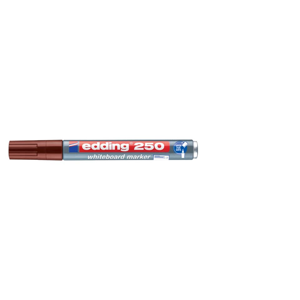 Boardmarker edding 250. Nachfüllbarer Marker für Whiteboards. Geruchsarme Tusche auf Alkoholbasis. Kann einige Tage offen liegen bleiben, ohne einzutrocknen. Rundspitze, Spitze austauschbar. Aluminiumschaft. Kappe umsteckbar in Schreibfarbe. Strichstärke: 1,5 - 3 mm. Schaftfarbe: grau. Farbe: braun