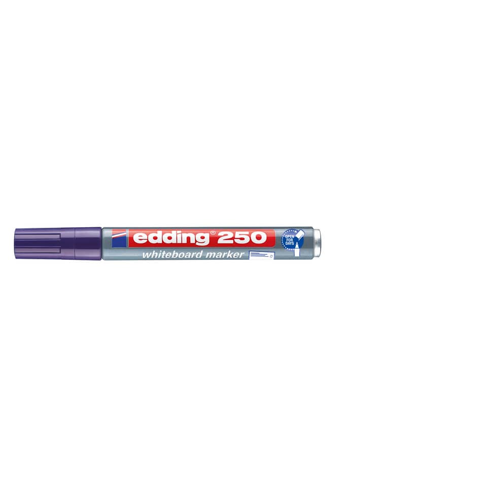 Boardmarker edding 250. Nachfüllbarer Marker für Whiteboards. Geruchsarme Tusche auf Alkoholbasis. Kann einige Tage offen liegen bleiben, ohne einzutrocknen. Rundspitze, Spitze austauschbar. Aluminiumschaft. Kappe umsteckbar in Schreibfarbe. Strichstärke: 1,5 - 3 mm. Schaftfarbe: grau. Farbe: violett