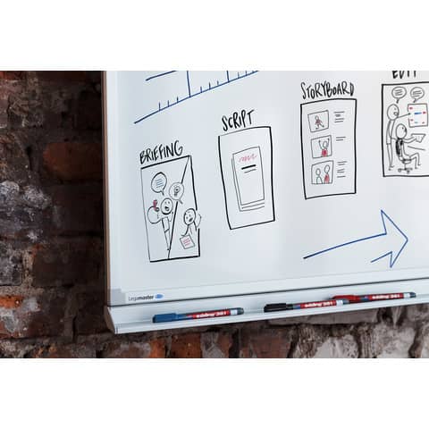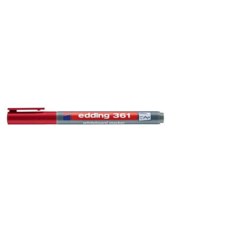 Boardmarker edding 361. Nachfüllbar. Geruchsarme Tusche auf Alkoholbasis. Rundspitze, Spitze austauschbar. Kunststoffschaft. Kappe umsteckbar, Clip vorhanden. Schaftfarbe: grau. Strichstärke: 1 mm. Schreibfarbe: rot.