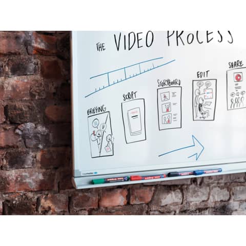 Whiteboardmarker-Set mit attraktiver Farbauswahl für farbenfrohe Markierungen auf Whiteboards, auch für Flipcharts geeignet. Die Schrift ist trocken abwischbar von praktisch allen nicht porösen Oberflächen wie Emaille und Melamin. Die Rundspitze hat eine Strichbreite von 1,5-3 mm. Dank der Cap-off-Technologie kann die Kappe mehrere Tage lang geöffnet bleiben, ohne dass das Produkt austrocknet (Testklima nach ISO 554). Die Whiteboard-Marker-Tinte ist lichtbeständig und schnell trocknend. Mit Tipps und Tricks zum Scribblen und einem QR-Code, der auf weitere Scirbbletutorials verweist, um die Arbeit am Whiteboard noch lebendiger zu gestalten. Das Set enthält die Farben 2x schwarz, rot, blau, grün, orange, braun und violett. Das Produkt ist nachfüllbar in den Farben schwarz, rot, blau und grün mit edding BTK 25 Nachfüllservice. Geeignete Ersatzspitzen (edding 28/360 Ersatzspitzen) sind erhältlich. Ohne Zusatz von Butylacetat.