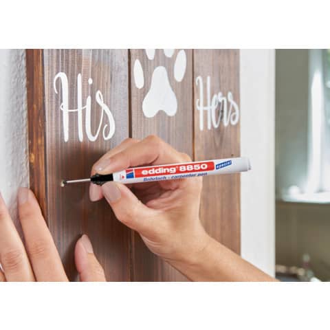Spezialmarker edding 8850 Bohrloch pen Reparieren und Pflegen zu Hause. Das extra lange und feine Mundstück ist ideal zum präzisen Markieren von schwer zugänglichen Stellen wie z.B. zum Anzeichnen von Bohrlöchern. Er schreibt auf Aluminium, Blech, Beton, Stein, Eisen, Stahl, Glas, Holz, Kunststoff und vielem mehr und ist damit universell einsetzbar. Zudem ist er permanent, wasser- und wischfest und schnelltrocknend. Extra langes, feines Mundstück mit Rundspitze. Weißer Kunststoffschaft mit umsteckbarer transparenter Kunststoffkappe mit Clip. Strichstärke 1 mm. Schreibfarbe: schwarz.