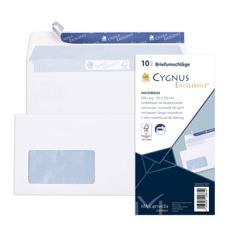 Produktinformationen "Briefumschlag mit Fenster, DIN lang, 100g/m², haftklebend, 10 Stück, weiß CYGNUS EXCELLENCE 30002391"