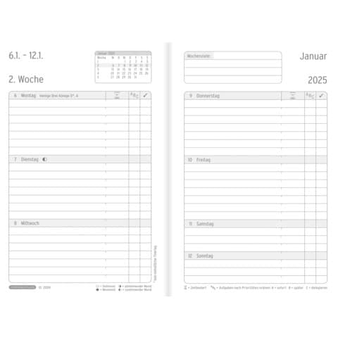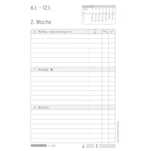 | Kalenderaufteilung: | 1 Woche / 2 Seiten |