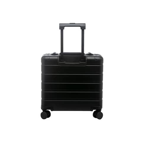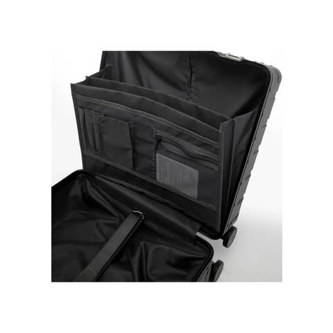Businesstrolley, arretierbares Teleskoptrolleysystem, Tragegriff, TSA Schloss, 360 Grad Leichtlauf-Doppelrollen Inlay: herausnehmbares Fächerfach mit Netzfach mit Reißverschluss,Einsteckfächern und Stifteschlaufen, geräumiges Overnightfach mit Packgurt. Größe: ca. 44 x 42 x 22,5 cm. Material: Aluminium. Farbe: schwarz.