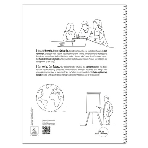 Collegeblock Style. Spiralbindung. Lochung: 4-fach. Microperforation. Ausführung des Papiertyps: ECF. Flächenmasse des Papiers: 70 g/qm. Kariert/liniert Twice 2in1. Papierformat: DIN A4 = 21,0 cm x 29,7 cm. Liniert, kariert. Farbe: weiß. Anzahl der Blätter: 80 Blatt.