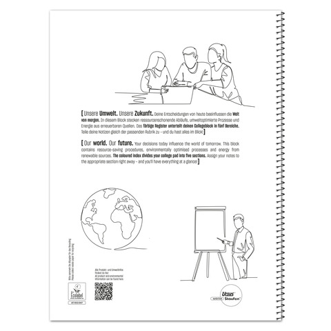 Register Collegeblock Style. Spiralbindung. Lochung: 4-fach. Microperforation. Ausführung des Papiertyps: ECF. Flächenmasse des Papiers: 70 g/qm. Mit Register 5-farbig. Papierformat: DIN A4 = 21,0 cm x 29,7 cm. Kariert 5mm. Farbe: weiß. Anzahl der Blätter: 100 Blatt.