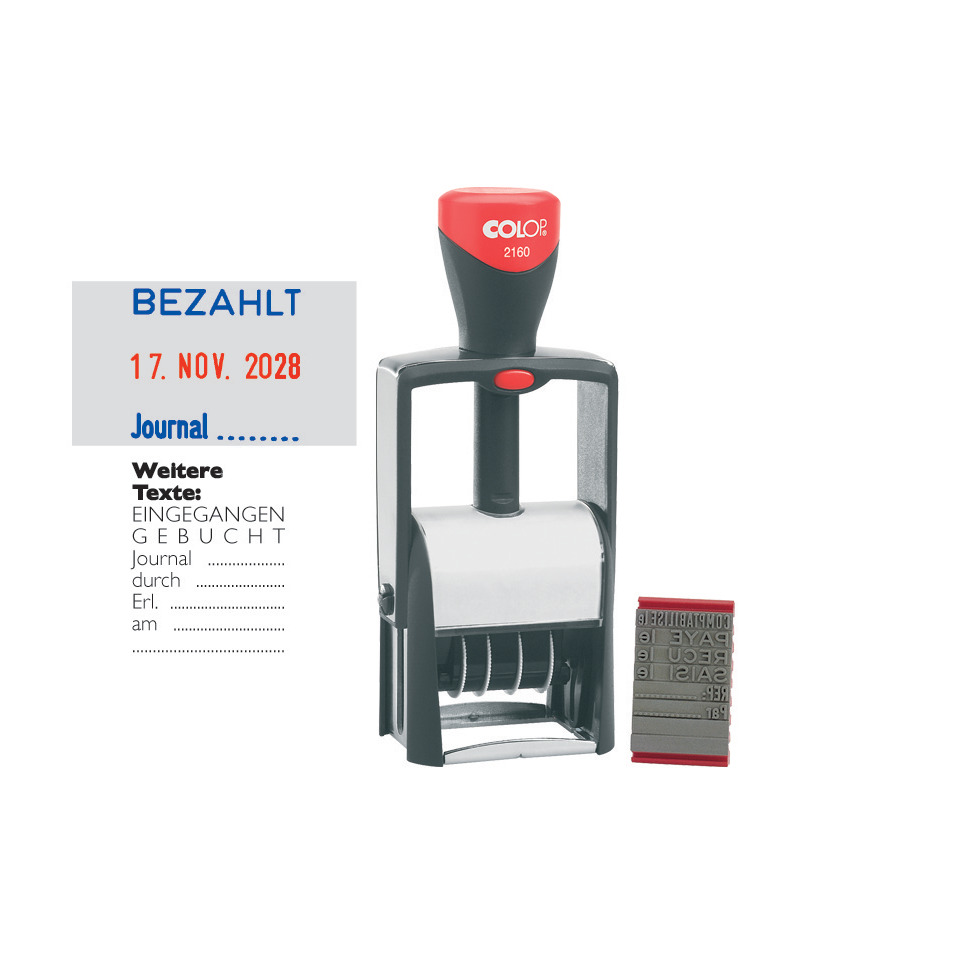Datumstempel 4mm Schrifthöhe, selbstfärbende Metallausführung mit 8 austauschbaren Textplatten: Bezahlt, Eingegangen, Gebucht..., Journal..., durch...., Erl...., am....., ...... (=nur Punkte ohne Text). Vergleichbar mit Trodat 5430L, 5430/L,