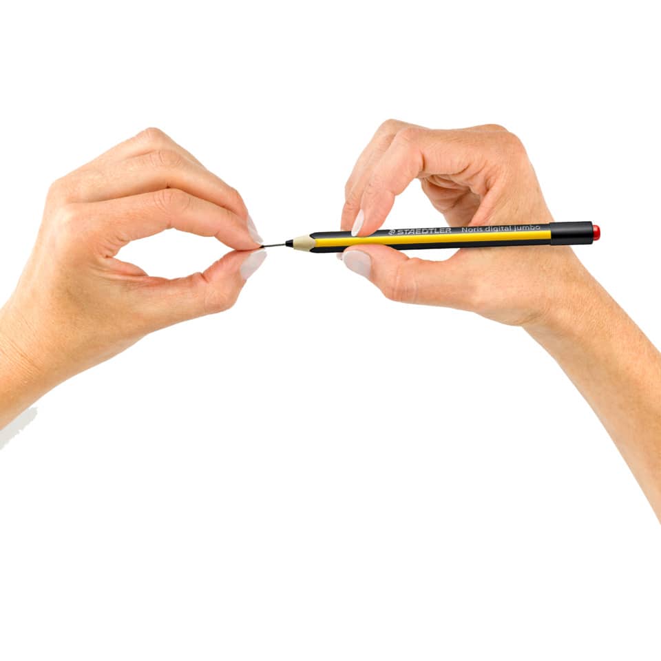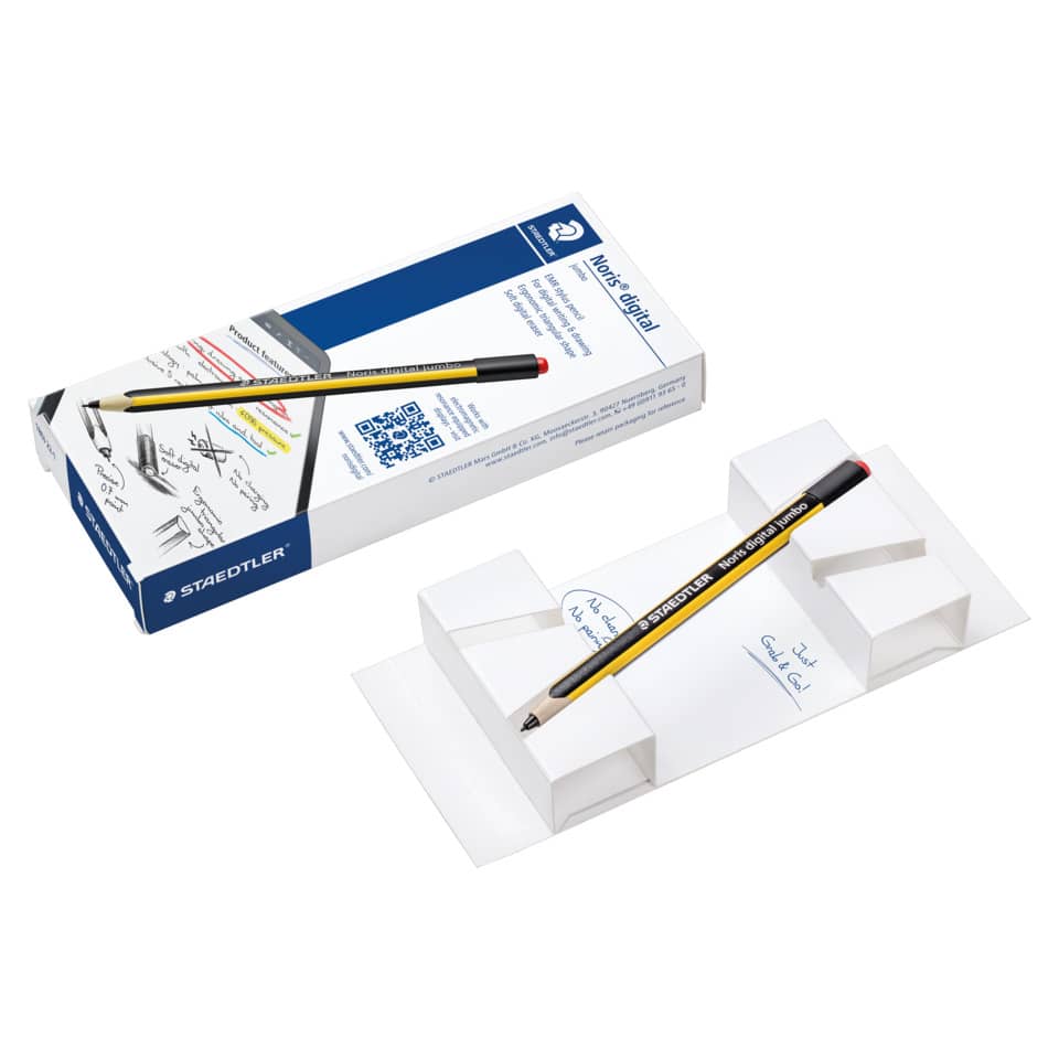 Noris® digital Stylus-Bleistift mit EMR-Technologie. Tradition trifft Innovation. Der Staedtler® Noris® digital sieht auf den ersten Blick aus wie ein normaler Bleistift und fühlt sich auch so an - er ist jedoch ein Eingabestift für Tablets, Smartphones und Notebooks (Bitte Kompatibilität beachten). Entwickelt für Menschen, die auf der Suche nach einem handschriftlichen Schreiberlebnis auf digitalen Endgeräten sind. Er unterscheidet sich in der Bedienung auf dem Display nicht von einem herkömmlichen Bleistift auf Papier. Ob unterwegs, beim Lernen, im Büro, beim Zeichnen oder zuhause beim Notieren von Omas Rezepten - ein digitaler Bleistift bietet dir mehr Möglichkeiten. Die Schlüsselkomponente des Noris digital ist die innovative EMR Mine von unserem Partner WACOM. Mit dieser Technologie nutzt der Stift ein elektromagnetisches Feld, das vom Display des Endgerätes (Tablet, Smartphone oder Notebook) erzeugt wird und geht mit diesem induktiv in Wechselwirkung. Die Technologie ermöglicht dir, wie auf Papier, den Handballen bequem auf dem Display abzulegen (Funktion ist abhängig von der App. Hier findest du unsere Empfehlungen). Dank dieser Möglichkeit und der ergonomischen Form des Noris® digital kannst du ermüdungsfrei schreiben. Ohne etliche Seiten auszudrucken, kannst du nun in PDFs, z.B. in Vorlesungsskripten digital notieren, markieren und sie anschließend teilen. Dadurch sparst du nicht nur Papier, sondern auch Zeit. Der Stylus wird, wie unsere Blei- und Buntstifte, aus dem Holzwerkstoff WOPEX hergestellt. Dank 4.096 Druckstufen kannst du die Linienbreite eines Abstriches wie bei einem Bleistift intuitiv variieren. Drücke mit dem Stylus einfach mehr oder weniger stark auf (Diese Funktion ist abhängig von der verwendeten App). Selbst die präzise 0,7 mm Schreibspitze wurde einem klassischen Bleistift nachempfunden. Durch die fortschrittliche Technologie enthält der Stylus keine Batterie und muss niemals aufgeladen werden. Zudem ist eine Koppelung mit dem Endgerät oder eine Installation von Treibern nicht notwendig. Komfortable Nutzung: Der Noris® digital kann jederzeit und überall genutzt werden. Egal, ob zuhause, in der Schule, im Büro oder sogar unterwegs – packe ihn aus und lege sofort los. Der Noris digital hat eine ergonomische, dreieckige und angenehm dicke Schaftform. Der Radierer am Ende des Stylus ist so weich, dass sich das Radieren auf Displays gewohnt anfühlt – wie das Radieren auf einem Blatt Papier.