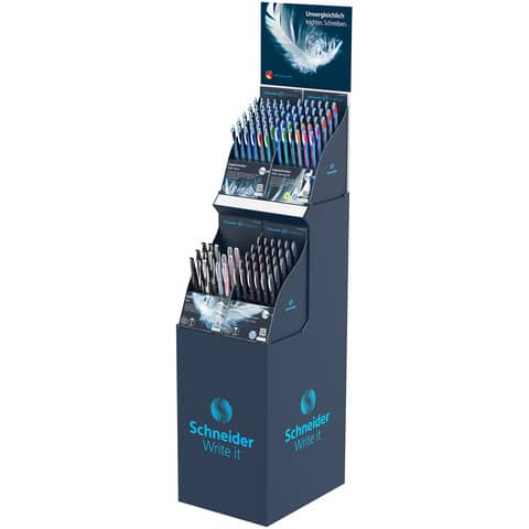 Tower-Display zum Trendthema leichtes Schreiben. Dies ermöglicht eine Sonderpräsentation von ausgewählten Schreibgeräten für ein unglaublich weiches - leichtes Schreibgefühl. Es beinhaltet je 30 Stk. Slider Rave, Slider Memo, One Business sortiert, 15 Stk. Füller Ray, sowie 20 Stk. gratis Minen 755 XB in blau und einen 1 Poster (84 x 30 cm).