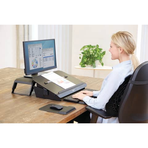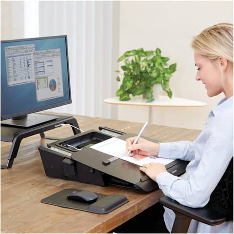 Dokumentenhalter Hana(TM) Series. Ideal für eine ergonomische Haltung bei der Verwendung von Dokumenten. Vermeidet Schmerzen im Rücken und Nacken. Perfekte ergonomische Position mit 5 Höhen- und Winkeleinstellungen (von 11,6 - 21,4 cm). Plattform gleitet nach vorne, wodurch die Tischfläche maximiert und ein ergonomischer Schreibbereich geschaffen wird. Versteckte Zubehörschublade mit Ladezugang für Mobilgeräte. Inklusive magnetischer Linienführung zum Halten von Papier und Lesehilfe. Elegantes und langlebiges Design. Größe (H x B x T): 115,9 x 562 x 349,3 mm. Farbe: schwarz.