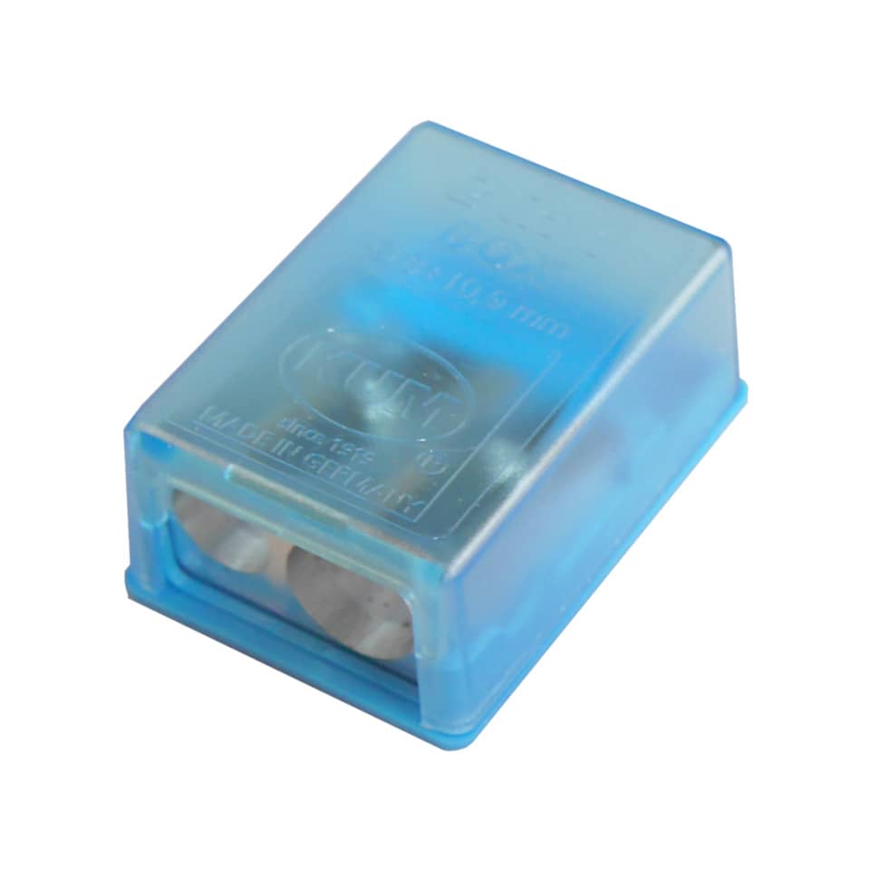 Doppel-Spitzdose, farbig sortiert. Kleiner Dosenspitzer aus Kunststoff mit transparentem Oberteil. Integrierter Magnesium-Spitzer für Stifte 8 + 11 mm. Die Messer sind auswechselbar. (KUM 2-in-1® Box)