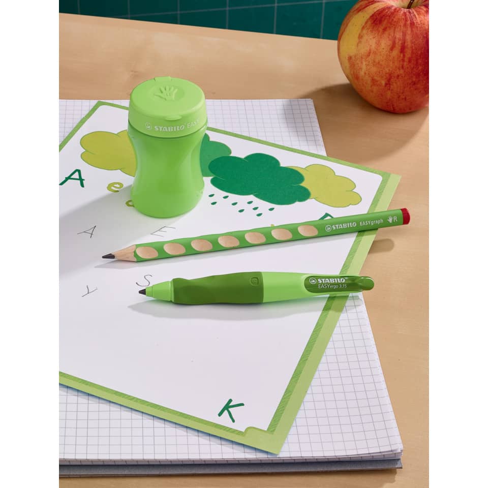 Ergonomischer Dosenspitzer STABILO® EASYsharpener. Verwendung für Stiftdurchmesser: für Minen: Ø 3,15 mm; für Holzstifte: Ø 7,42 mm und Ø 9,5 mm. Ausführung der Spitzerform: Zylinder. Material des Spitzers: Gehäuse: PS, Messer: Stahl. Spitzenform: spitz-lang und stumpf-kurz. Farbe des Spitzers: grün. Ausführung Behälter: Runddose für Rechtshänder, mit innovativen Griffmulden für eine optimale Handhabung. Mit verschließbarem Deckel und Namensschild, Dosen-Oberteil: PP, Dosen-Unterteil: PE. Füllstand sichtbar, dank transluzentem Material, grün (transluzent), Lochverschluss vorhanden. Spitzer hat 3 verschiedene Öffnungen: Perfekt für EASYcolors, EASYgraph, EASYergo 3.15 und alle dünnen und dicken Holzstifte. Sicherheitsschraube an der Spitzerklinge zum Schutz der Kinder. Größe (B x H x T): 48 x 68 x 40 mm.