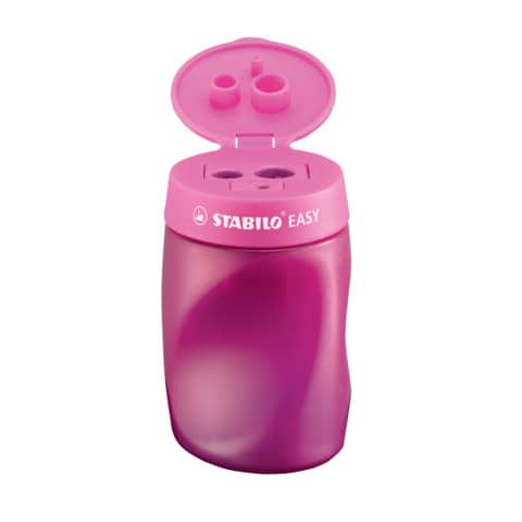 Ergonomischer Dosenspitzer STABILO® EASYsharpener. Verwendung für Stiftdurchmesser: Ø 3,15 mm (Minen), Ø 7,42 mm (dünne Buntstifte), Ø 9,5 mm. Ausführung der Spitzerform: Zylinder. Material des Spitzers: Gehäuse: PS, Messer: Stahl. Spitzenform: spitz-lang und stumpf-kurz. Farbe des Spitzers: pink. Ausführung Behälter: Runddose für Rechtshänder, mit innovativen Griffmulden für eine optimale Handhabung. Mit verschließbarem Deckel und Namensschild, Dosen-Oberteil: PP, Dosen-Unterteil: PE, pink-translucent, Lochverschluss vorhanden. Spitzer hat 3 verschiedene Öffnungen: eine für Minen und 2 für EASYcolors, EASYgraph, EASYergo 3.15 und alle regulären Holzstifte. Sicherheitsschraube zum Schutz der Kinder. Größe (B x H x T): 48 x 68 x 40 mm.