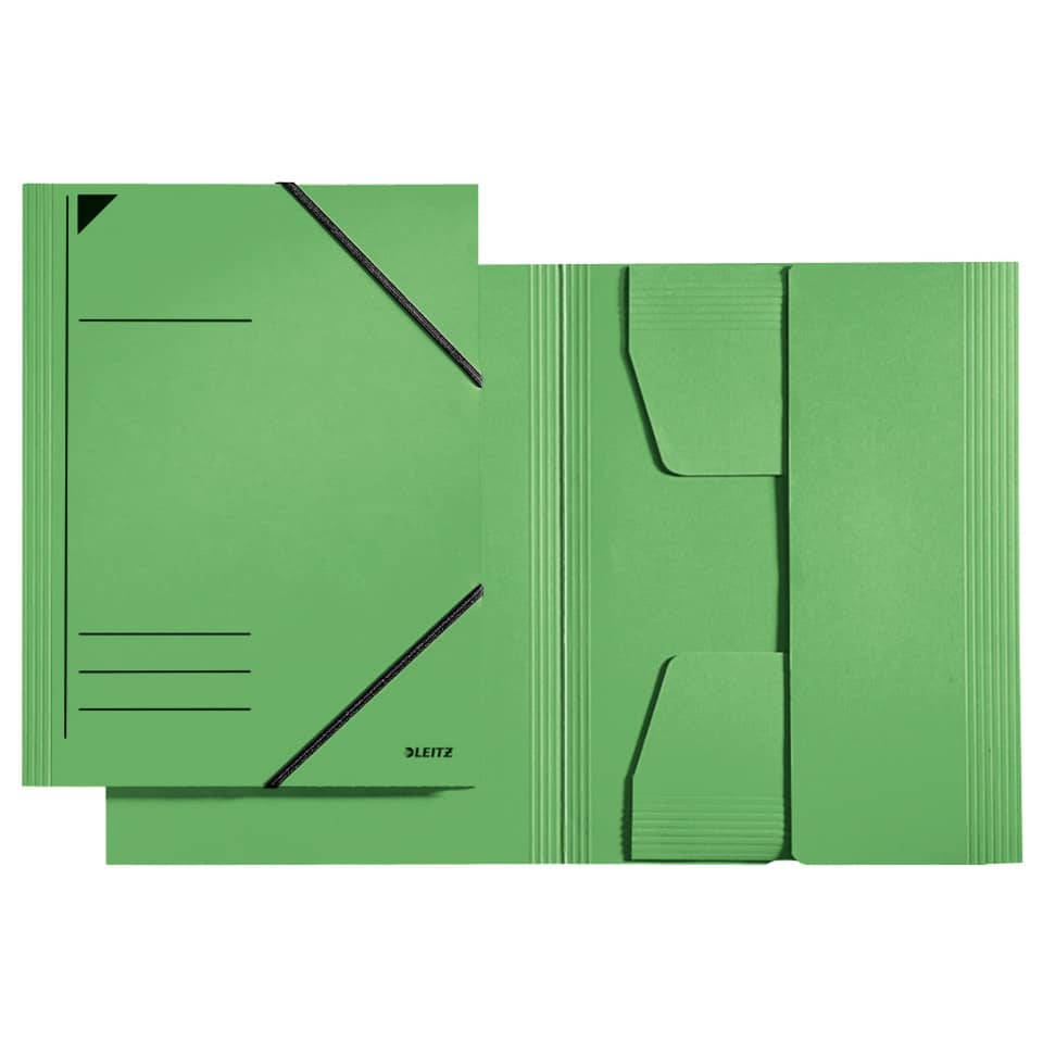 Leitz Eckspannermappe mit 3 vollflächig verklebten Klappen am Unterdeckel. Mit Gummizug-Verschluss über den Vorderdeckel-Ecken. Material: 100% Pendarec-Karton 430 g/qm (RC). Für A4. Farbe: grün.