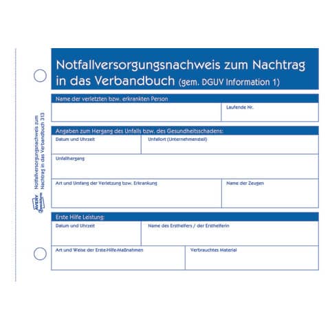 Der Meldeblock 313 als Notfallversorgungsnachweis zum Nachtrag in das Verbandbuch von AVERY ZWECKFORM gehört in jeden betrieblichen Verbandskasten. Durch die Mikroperforation und die Lochung können die einzelnen Seiten schnell und unkompliziert herausgetrennt und datenschutzkonform verwahrt werden. Der Meldeblock zum Versorgungsnachweis laut DGUV Vorschrift 1 beinhaltet 50 Blatt mit Vordruck zum einfachen Ausfüllen und passt durch das handliche A6 Format in jeden Verbandskasten, bietet jedoch hinreichend Platz für alle benötigten Angaben. Die Formulare und Vordrucke von Avery Zweckform sind zuverlässige, bewährte Hilfen für viele gesetzlich geregelte, betriebliche Vorgänge und werden natürlich regelmäßig von Rechtsexperten auf Aktualität geprüft.