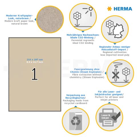 Eigenschaften "Etiketten aus Silphie-Papier permanent, 210x297mm, 20 Stück, braun HERMA 10758"
