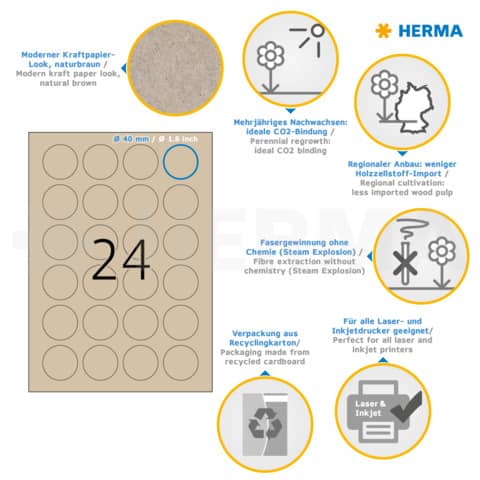 Eigenschaften "Etiketten aus Silphie-Papier permanent, Ø40mm, naturbraun HERMA 10761"