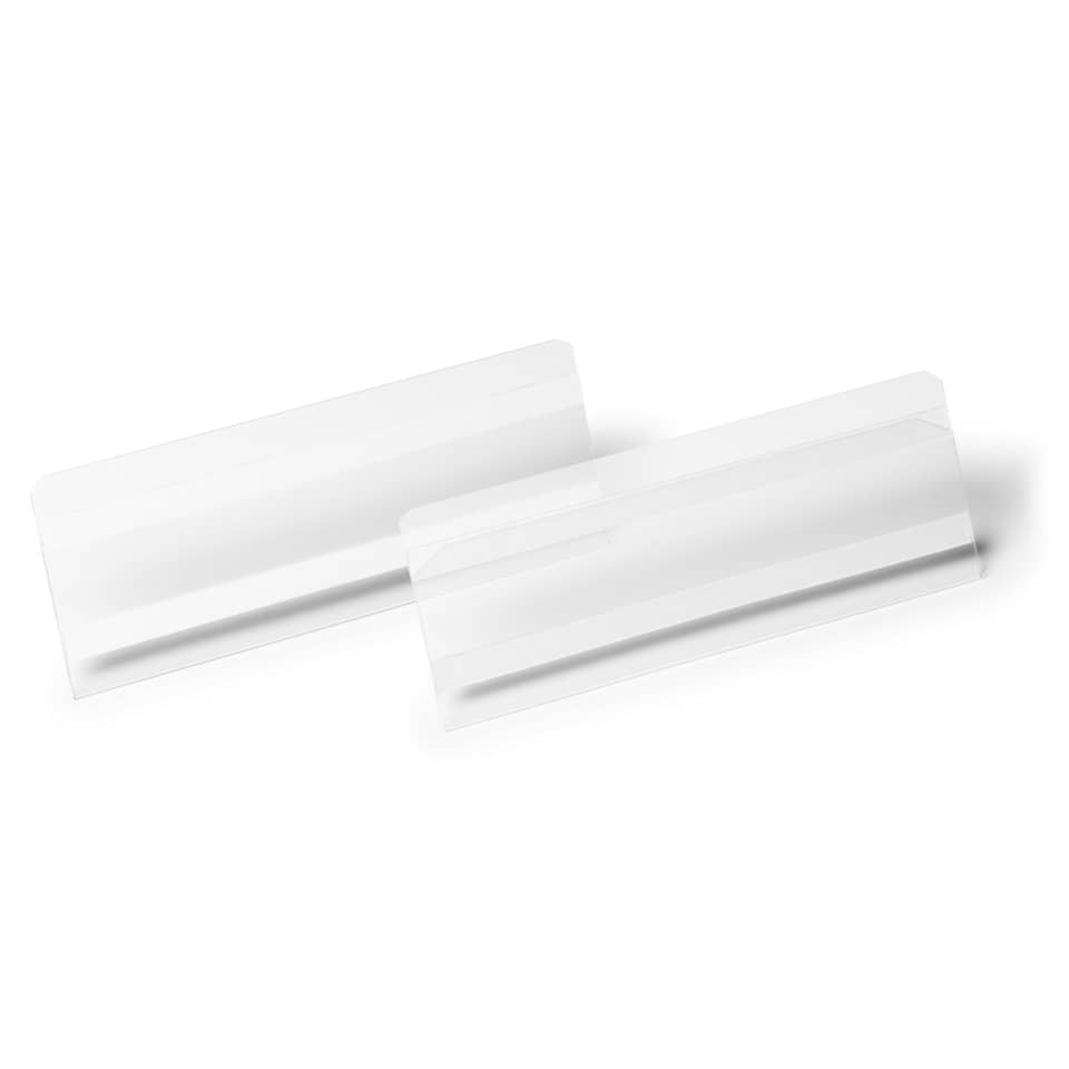 Etikettentasche 1/2 A5 quer HARD COVER. Werkstoff: PET. Ausführung: dokumentenecht. Farbe: transparent. Mit zwei rückseitigen Permanent-Klebestreifen, rückstandsfrei ablösbar, scannertauglich, VDA-konform, schneller Austausch der Einsteckschilder durch abgeschrägte Vorderkante. Produktverwendung: Regale, Kunststoffbehälter, Holz und Kartonagen. Anordnung der Lage der Öffnungsseite: oben und seitlich. Größe Innenteil (B x H): 210 x 74 mm. Art der Verpackung und Inhalt: 10 Stück.