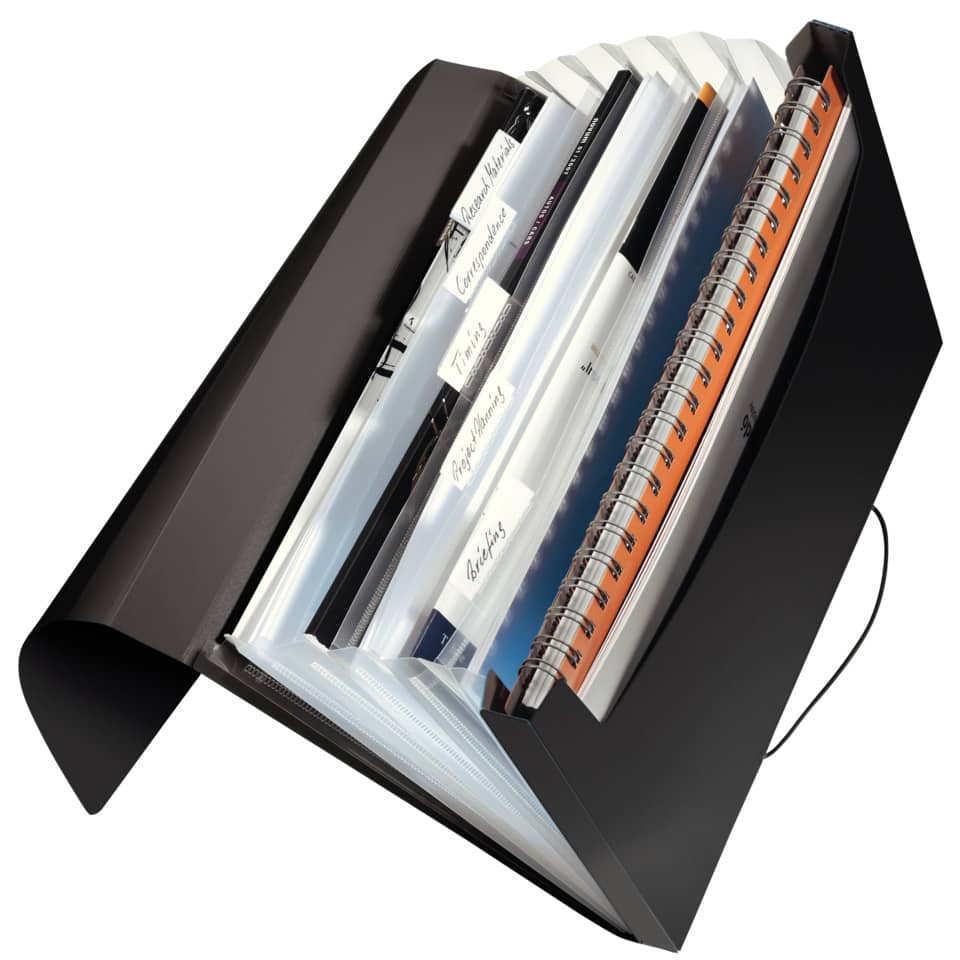 Leitz Fächermappe Solid. Für die Projektorganisation. 5 dehnbare Fächer mit 5 Beschriftungstaben inklusive Beschriftungsschildchen. Mit zusätzlichem Fach für sonstige Utensilien oder Notizbücher. Verschluss mit Gummizug. In Duo-Optik. Für bis zu 250 Blatt. Material: Polyproplyen (PP). Format: 330 x 245 x 38 mm. Farbe: schwarz.