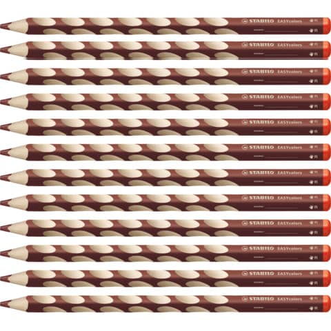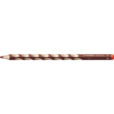 Ergonomischer Buntstift STABILO® EASYcolors. Ausführung der Schaftform: Dreikantform. Farbe des Schaftes: in Malfarbe. Material des Schaftes: PEFC Lindenholz. Schaft lackiert. Größe ( Ø x L): 9 x 175 mm. Für Rechtshänder - sichtbar durch roten Farbcode am Stiftende. Dreikantform und rutschfeste Griffmulden für eine entspannte Handhaltung. In Holz aus nachhaltiger Waldwirtschaft. Mit Namensfeld. Stärke der Mine: 4,2 mm. Schreibfarbe der Mine: hellbraun.