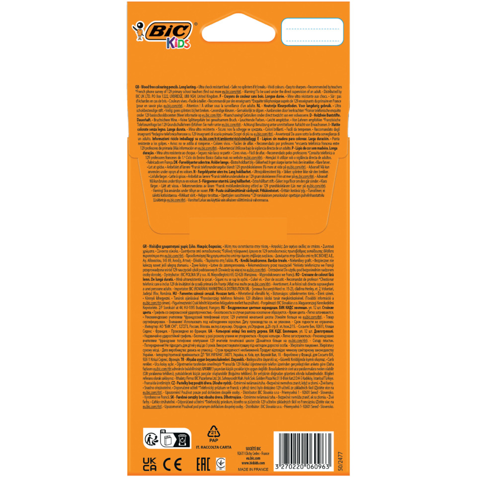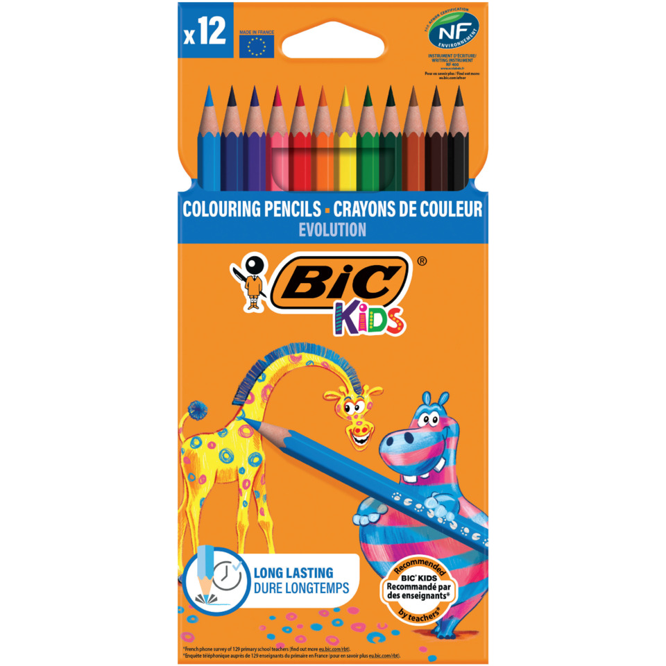 Buntstift BIC® KIDS ECOlutions EVOLUTION. Ausführung der Schaftform: sechskantig. Farbe des Schaftes: Schreibfarbe. Material des Schaftes: holzfrei, aus 50% recyceltem Material. Der Recycling-Prozentsatz wird anhand des Gesamtgewichts des Produkts berechnet. Schaft lackiert. Größe (Ø x L): 6,9 x 175 mm. Robuste und widerstandsfähige Mine, kein Splittern bei gewaltsamem Bruch, lebendige Farben, hoch pigmentierte Mine. Stärke der Mine: 3,2 mm. Schreibfarbe der Mine: 12-farbig sortiert. Ausführung des Inhalts mit Packung: Kartonetui à 12 St.