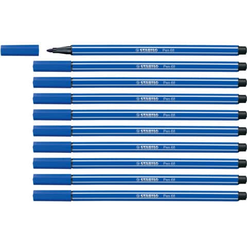 Premium-Filzstift STABILO® Pen 68, Material des Schaftes: Kunststoff, Farbe des Schaftes: Schreibfarbe mit weißen Kantenstreifen, Ausführung: , Rundspitze, Art der Schreibflüssigkeit: Tinte auf Wasserbasis, geruchsneutral, farbintensiv - für kräftige Linien und deckende Flächen. Hohe Brillanz und Leuchtkraft. Bis zu 24 Stunden Austrocknungsschutz ohne Kappe. Die robuste M-Spitze sorgt für gleichmäßige Farbabgabe. Ventilierte Kappe - am Stiftende aufsteckbar, Strichstärke: 1 mm, Schreibfarbe von Schreibgeräten: ultramarinblau, Zertifikate und Zulassungen: CE-Zeichen.