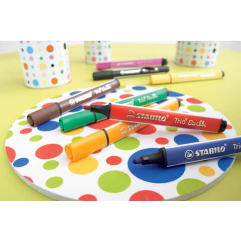 Dreikant-Filzstift STABILO® Trio® Scribbi. Material des Schaftes: Polypropylen. Farbe des Schaftes: Schaft in Schreibfarbe mit weißen Kantenstreifen. Ausführung: gefederte Rundspitze, Spitze druckgesichert. Art der Schreibflüssigkeit: Tinte auf Wasserbasis, auswaschbar, farbintensiv. Dreikant-Design für sicheren, ergonomischen Halt in Kinderhänden. Strichstärke: 1,5 - 2,0 mm. Schreibfarbe von Schreibgeräten: fleischfarben. Zertifikate und Zulassungen: CE.