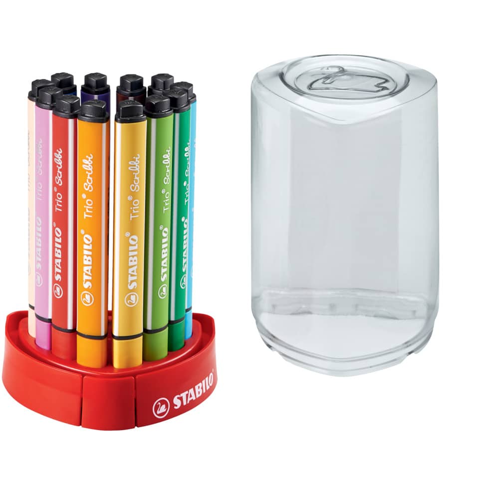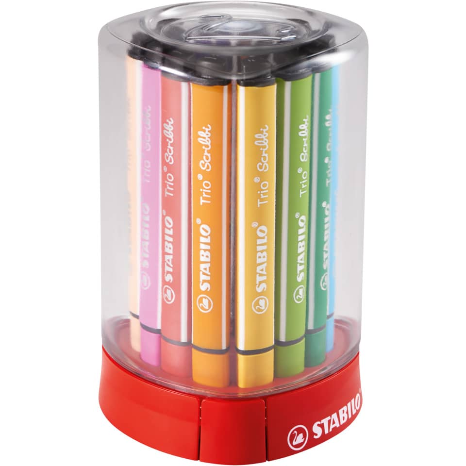 Fasermaler Dreikant-Fasermaler STABILO® Trio® Scribbi Tischset. Material des Schaftes: Polypropylen. Farbe des Schaftes: Schaft in Schreibfarbe mit weißen Kantenstreifen. Ausführung: Rundspitze, Spitze druckgesichert. Art der Schreibflüssigkeit: Tinte auf Wasserbasis, auswaschbar, farbintensiv. Dreikant-Design für sicheren, ergonomischen Halt in Kinderhänden. Designpreise: 2006 iF product design award, 2006 pbs Industrie Produkt des Jahres 2006. Strichstärke: 1,5 - 2,0 mm. Schreibfarbe von Schreibgeräten: sortiert. Zertifikate und Zulassungen: CE. Ausführung des Inhalts mit Packung: Tischset mit 12 Stiften.