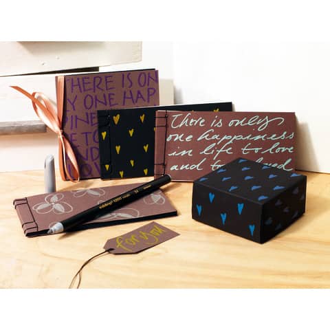 Fasermaler zum Schreiben und Dekorieren, Zeichnen und für Layoutarbeiten in attraktiven Metallicfarben auf hellem und sogar dunklem Papier. Die Rundspitze verfügt über eine Strichbreite von 1-3 mm. Die wasserbasierte Tinte im Filtersystem ist extrem lichtbeständig.