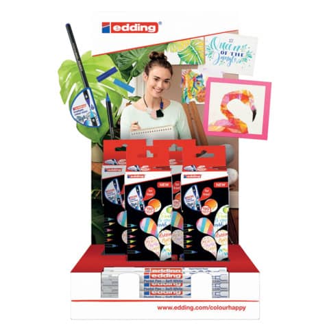 Dank der weichen, flexiblen Pinselspitze perfekt geeignet zum Ausmalen und für Handlettering. Die wasserbasierte Tinte schlägt nicht durch Papier. Das Display enthält 4 Stück Colour Happy Box, Inhalt: edding 1340 Pinselstift in den Farben schwarz, rot, blau, grün, gelb, orange, braun, violett, pink, hellblau, hellgrün, ocker, türkis, hellorange, silbergrau, aprikose nude, honigmelone, mandarine, azurblau und papaya, 3x edding 1500 Pastellstift in der Farbe Weiß und 20 Infokarten für Anwender. Colour Happy Box: edding 1340: 1x schwarz, rot, blau, grün, gelb, orange, braun, violett, pink, hellblau, hellgrün, ocker, türkis, hellorange, silbergrau, aprikose nude, honigmelone, mandarine, azurblau und papaya, Weitere Einzelprodukte: edding 1500: 3x weiß.