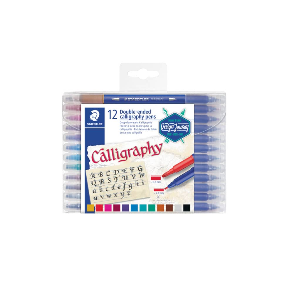 Zweispitzmaler Calligraph duo Doppelfasermaler Kalligrafie, Material des Schaftes: PP - garantiert lange Lebensdauer, Farbe des Schaftes: dunkelblau, Ausführung: , Doppelspitze, Art der Schreibflüssigkeit: Tinte, Strichstärke: breite Spitze: ca. 3,5 mm, feine Spitze: ca. 2,0 mm, Schreibfarbe von Schreibgeräten: 12 sortierte Farben, Ausführung des Inhalts mit Packung: mit Aufhängelsche und Kartoneinleger, vorne mit Klebepunkt verschlossen, 12 ST in transparenter Faltschachtel.