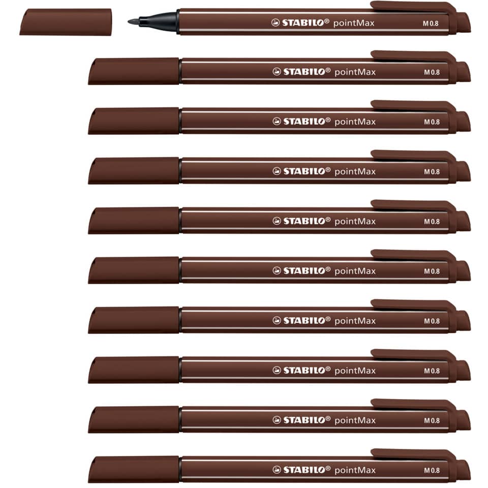 Filzschreiber STABILO® pointMax. Material des Schaftes: Kunststoff. Farbe des Schaftes: Schreibfarbe mit weißen Kantenstreifen. Ausführung: Rundspitze aus robustem Nylon, Spitze druckgesichert. Art der Schreibflüssigkeit: Tinte auf Wasserbasis, geruchsneutral. Ideal für ausdrucksstarkes Schreiben und Skizzieren. Ventilierte Kappe - am Stiftende aufsteckbar. Strichstärke: 0,8. Schreibfarbe von Schreibgeräten: braun.