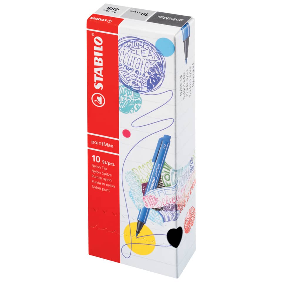 Filzschreiber STABILO® pointMax. Material des Schaftes: Kunststoff. Farbe des Schaftes: Schreibfarbe mit weißen Kantenstreifen. Ausführung: Rundspitze aus robustem Nylon, Spitze druckgesichert. Art der Schreibflüssigkeit: Tinte auf Wasserbasis, geruchsneutral. Ideal für ausdrucksstarkes Schreiben und Skizzieren. Ventilierte Kappe - am Stiftende aufsteckbar. Strichstärke: 0,8. Schreibfarbe von Schreibgeräten: ultramarinblau.