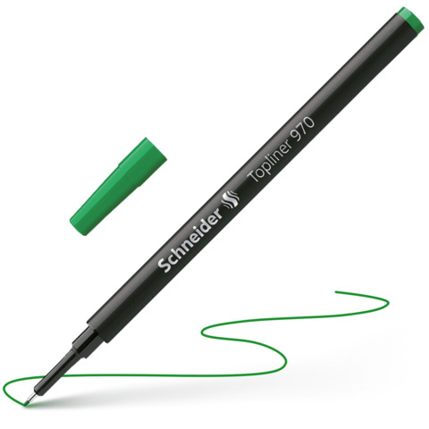Fineliner-Mine Topliner 970. Verwendung für Produkt: Topliner 911. Typbezeichnung der Mine: Euro-Format. Ausführung der Spitze: Spitzenfassung aus Edelstahl für gleichbleibend feine Schrift. Art der Schreibflüssigkeit: Tinte hergestellt auf Wasserbasis, nicht löschbar, lichtbeständig gegeben. Die Stifte mit dem Cap off-Symbol trocknen nicht ein, wenn sie 2 - 3 Tage offen liegen. Strichstärke: 0,4. Schreibfarbe von Schreibgeräten: grün.