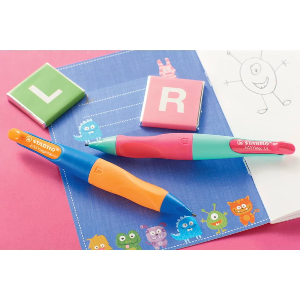 Ergonomischer Druckbleistift STABILO® EASYergo 1.4. Ausführung: Spitze voll versenkbar, Mine auswechselbar, Mine federnd gelagert, Druckmechanik. Material des Schaftes: Polypropylen. Mit Feld zur Namensbeschriftung. Ausführung der Griffzone: längere Griffzone (für ältere Kinder) aus rutschfestem Material. Innovatives, ergonomisches Stift-Design speziell für Kinderhände. Entspannte Handhabung und leichte Schreibführung, nur geringer Druck notwendig. Unterstützt präzises Schreiben auf feinen Linien und kariertem Papier. Farbe des Schaftes: türkis/neonpink. Stärke der Mine: 1,4 mm - daher Spitzen nicht notwendig. Bezeichnung der Härte: HB. Ausführung des Inhalts mit Packung :Einzelstift, lose (Linkshänder).