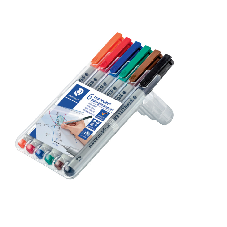 Feinschreiber Lumocolor® non-permanent Universalstift, Material des Clips: PP-Rezyklat-Kunststoff. für Overhead-Projektion und fast alle Flächen, feucht abwischbar von Folien, wasserlösliche Tinte, schnelltrocknend, höchste Farbbrillanz, mit Clip, Schaft und Kappe aus 97% aus PP-Rezyklat-Kunststoff garantieren lange Lebensdauer. Ausführung Stift:. nachfüllbar. Typbezeichnung der Mine: Tintenspeicher, Farbe des Schaftes: grau, Farbe der Kappe: in Schreibfarbe. Ausführung Spitze: Ausführung der Spitze: Faserspitze (Rund), Strichstärke: ca. 0.4 mm. Ausführung Schreibflüssigkeit: geruchsarme Tinte, Schreibfarbe von Schreibgeräten: 2 rot, 3 blau, 4 orange, 5 grün, 7 braun, 9 schwarz. Ausführung des Inhalts mit Packung: aufstellbare STAEDTLER Box mit 6 Farben.
